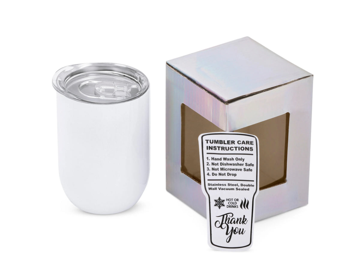 White stemless tumbler 12 oz. Can be used for hot or cold beverages