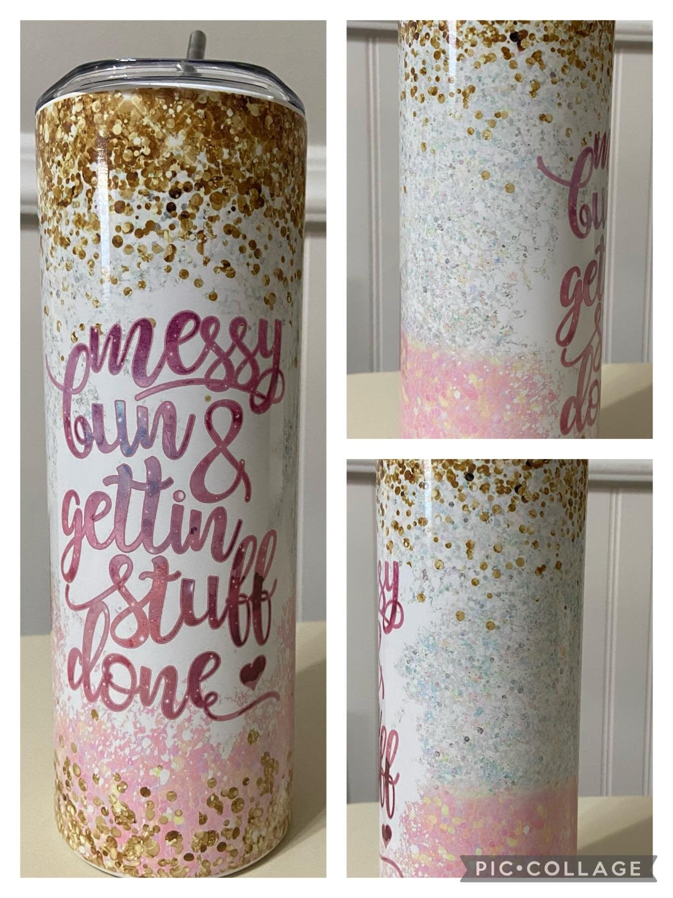 “Messy bun and getting stuff done” full wrap tumbler Glitter design coloring, not actual glitter